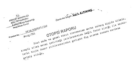 * Lezyonlardan önemli bir kısmının ray şeklinde ekimoz olarak tanımlandığı ve uzunlukları da dikkate alındığında bunların uzunluğu olan ve konveks yüzeyli sert ve künt cisim veya cisimlerin direkt havaleleri ile meydana getirilmiş nitelikte oldukları, baştaki lezyonlar ile cilt altında saptanan yaygın hematom birlikte değerlendirildiğinde ölümünü mucip kafa içi kanamanın da direkt künt tarvma sonucu meydana gelmiş olacağı, ayrıca boyun bölgesi ile çeneye yönelik ağır künt travmalarına maruz kalmış olup çene kemiğinde kırık meydana gelmiş olduğu, tüm künt travmatik değişimler birlikte değerlendirildiğinde bu bulguların değişik literatürlerde tanımlanan kaba dayak işkencesi ile uyumlu bulunduğu,