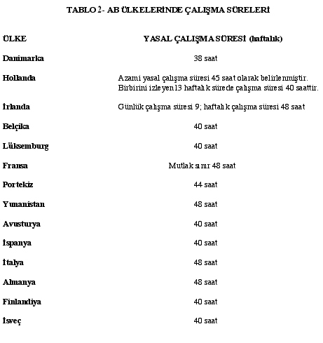 AB ülkelerinde yaşanan tüm teknolojik gelişmeye rağmen işçi sınıfı ve emekçilerin çalışma süreleri, iş akitleri, haftalık tatil süresi ve çalışma saatleri vb. kuralsızdır, esnektir. Kimi AB ülkelerinde farklılık göstermekle beraber haftalık çalışma saati ortalaması 40tır. (Tablo 2)