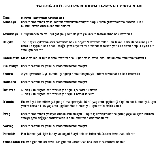 Yine aynı raporda patron örgütlerinin kıdem tazminatından duydukları rahatsızlık şu şekilde dile getirilmektedir: Türk iş hukuku sistemi içinde yarım yüzyıldan fazla bir süreden beri gelişen kıdem tazminatı müessesesi kökeninde kıta Avrupası iş hukuku sistemlerinden esinlendiği halde, bugünkü yapısı içinde ve hukuki nitelikleri ile, ülkemizde diğer ülkelerdeki sistemlerden farklı bir özellik kazanmıştır. Kapsamının genişliği, birden çok amaca yönelmiş olması, işgücü maliyetini önemli ölçüde etkilemesi bakımından kıdem tazminatı iş hukuku sistemimizde kendine özgü bir sistem yaratmıştır. Daha sonra AB ülkelerindeki bazı uygulamalar örnek gösterilmektedir (Tablo 6).