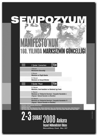 Manifesto’nun ışığında geçen 160. yılda Ankara’da “Manifesto’nun 160. yılında marksizmin güncelliği” başlığı ile bir sempozyum düzenleniyor. Emek Araştırmaları Merkezi Girişimi tarafından düzenlenecek olan sempozyuma Mülkiyeliler Birliği, Jeoloji Mühendisleri Odası, Metalurji Mühendisleri Odası, Çevre Mühendisleri Odası Ankara Şubesi, Elektrik Mühendisleri Odası Ankara Şubesi, İnşaat Mühendisleri Odası Ankara Şubesi, Kimya Mühendisleri Odası Ankara Şubesi, Mimarlar Odası Ankara Şubesi destek veriyor.