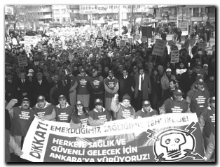 Sermaye devleti SSGSS saldırısına başlatmak için son hazırlıklarını yaparken, sendikalar ve meslek örgütleri merkezi düzeyde “Herkese Sağlık Güvenli Gelecek” şiarıyla geçtiğimiz hafta Ankara’ya yürüdü. Ankara yürüyüşünün sembolik gerçekleşmesi ve sendikal bürokrasinin denetiminde geçmesi eylemin gücünü ve etkisini baştan zayıflatmış olsa da, yine de eylemin belli bir anlamı oldu.