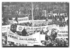 - Aşağıdan havayı yükseltmek lazım. Yukardan karar almak yetmiyor. Birkaç sendikanın işçileri bölge toplantıları düzenleyebilir. Burada doğru taban çalışması yapmalı. Örneğin Türk-İş, DİSK genel grev kararı aldı üç gün sonraya. Biz bunu nasıl uygulayacağız? Televizyondan basın açıklamasıyla pazartesi genel grev, kimse işe gitmeyecek desen ne olur? Acaba hayata geçecek mi? Sistemi durduracak bir genel grev örgütlemek gerekir. Ulaşım çalışıyor, gaz çalışıyor, bankalar çalışıyor... Neymiş belediyeler çöpleri toplamıyormuş. Ne işe yarar. Grev kararı almadan önce alt yapısını hazırlayacaksın, grev dediğin anda hakikaten hayat duracak.