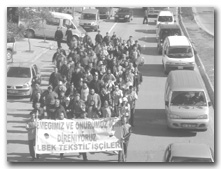 İmam Hatip Lisesi önünde yürüyüşe geçen işçiler, Elmabahçesi’ndeki fabrika aralarından sloganlarına devam ederek tüm işçi havzasını dolaştılar. Yaklaşık yarım saat süren eylemde, diğer çalışan işçiler camlara çıkarak, İlbek işçilerine alkışlarla destek verdiler.