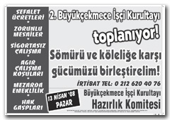 Bir süredir hazırlıklarını sürdürdüğümüz 2. Büyükçekmece İşçi Kurultayı ile bölgemizdeki örgütlenme ve mücadele arayışlarına kendi cephemizden bir müdahalede bulunmayı amaçlıyoruz. Önümüze koyduğumuz kurultay çalışmasıyla, kölece çalışma ve yaşam koşularına karşı hem yaygın bir propaganda faaliyeti örgütlemeye hemde bu çalışmayı bir süreç biçiminde örgütleyerek ileri öncü işçileri bir araya getirerek kalıcı örgütlülükler yaratmaya çalışıyoruz. Sınıfın bölgedeki örgütlülüğünü geliştirmek açısından düzenleyeceğimiz kurultayın işlevli olacağını düşünüyor, bu bilinçle sürece yükleniyoruz.